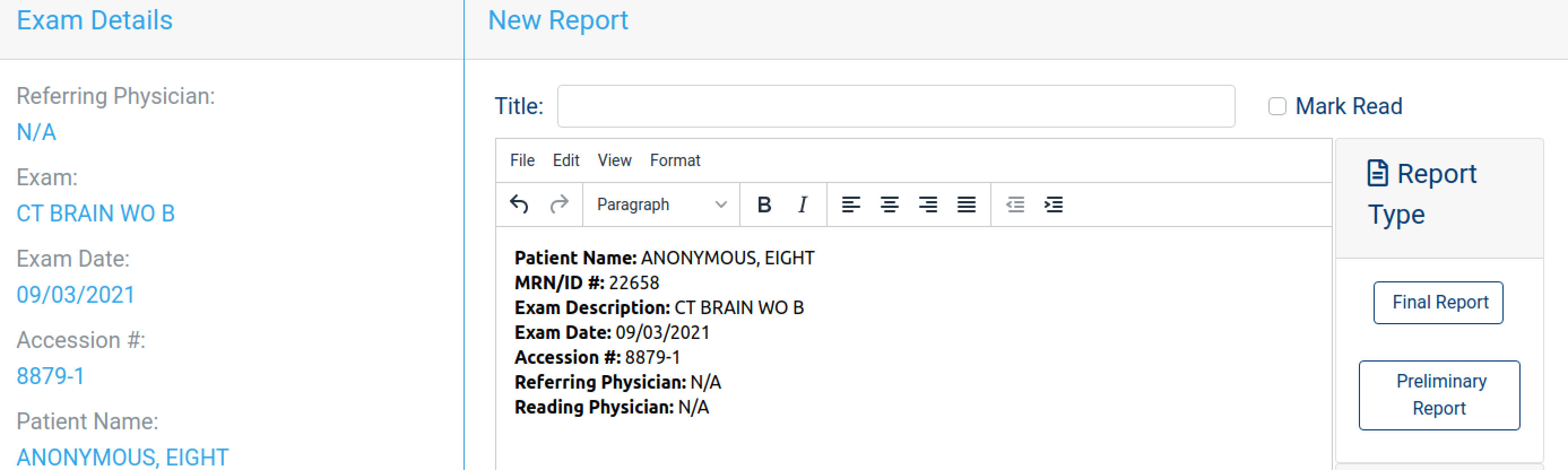 - The New Report screen displays study details and an editor for the report, if a template was chosen the text will already be in the editor. Additional options like Report type, Alert level, attachments, read state, and title can be set here. The report can be filled out with mouse/keyboard or using a microphone by enabling it with the microphone button. You can also view the study quickly by clicking on the eye button which opens the study in the Web Viewer.