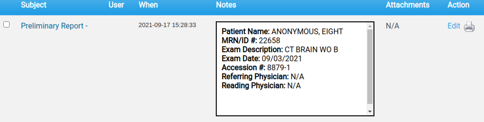 - After clicking save the screen is redirected to the Manage Documents page where you can see the newly added report. The report can also be viewed by clicking on the report icon on the study row, whose color reflects the Alert level of the report.